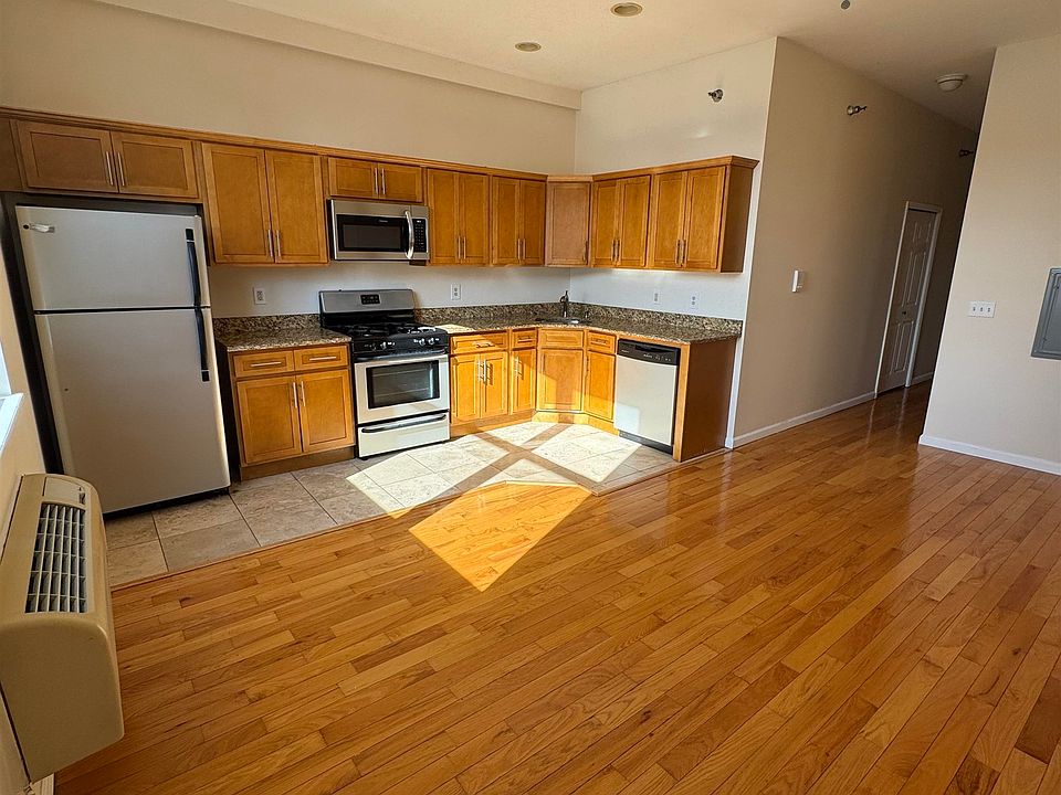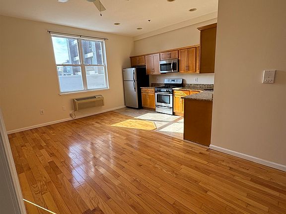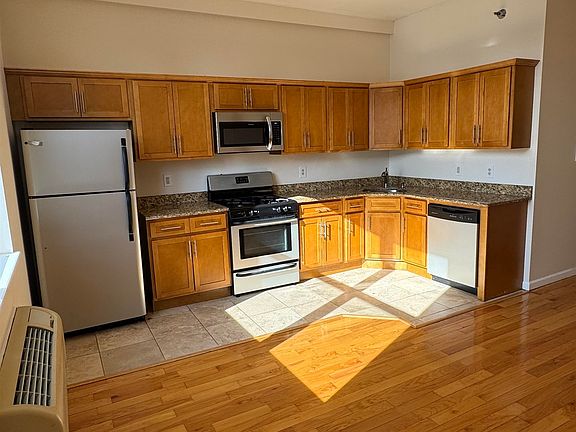 Modern, bright, top/3rd floor corner 2 bedroom unit in newer building. Kitchen features oak cabinetry, SS appliance package and granite counters. Hardwood floors throughout, tiled bath and laundry at your doorstep! Amazing location with NY bus at the corner. Supermarket and restaurants a very short distance away. 2 blocks to beautiful Blvd East and 5 minutes to Hoboken! Great for roommates. A commuter's dream!