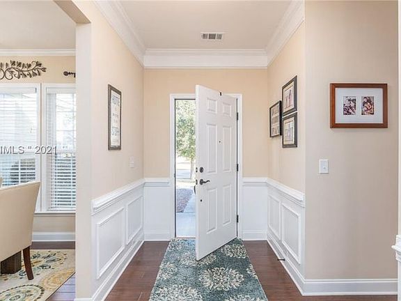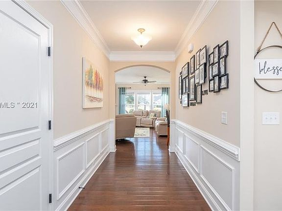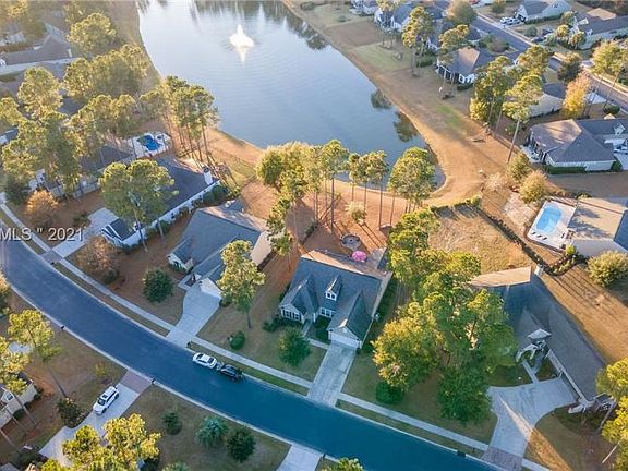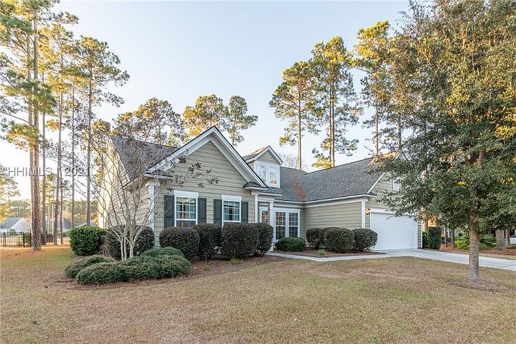More than meets the eye! Great for entertaining, this home will fit everyone, family and guests! 4 bed, 4 bath w loft, 2 Master bedrooms both on 1st floor w walk in closets. Upgraded kitchen features huge island, elevated dishwasher, range hood, pull out drawers, large pantry, breakfast bar + 2 dining areas. Fireplace in living room, ceiling fans, tray ceilings w crown throughout. Lots of closets and storage. Enjoy sunsets over the beautiful lagoon at the outside custom fire pit fit with pavers. 3 car tandem garage, enough room for a golf cart to take to the awesome amenities! May River High and River Ridge Academy w walking trail to RRA