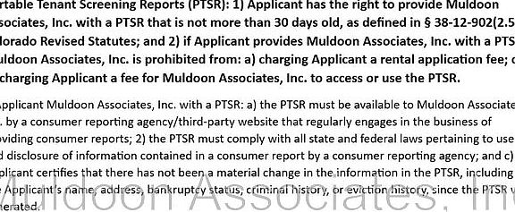 This property is only to be used for existing tenants who are reapplying or roommates who are applying for an already occupied property or other situations as needed or required by management. If you are applying for an advertised property please be sure to apply under the property of your preference. Thank you. Pet Policy Determined per property. 35 dollars per month pet rent per pet. No pets with any history of aggression. Pet policy does not apply to service or companion animals. We use a third party pet/animal policy and screening service. All applicants must complete a pet/animal application whether they have pets/animals or not. No charge if you do not have pets/animals! Link provided during application process. Muldoon Associates, Inc. is a dedicated fair housing advocate and does not discriminate based on race, color, national origin, religion, sex, familial status or handicap (disability).ancestry, marital status or creed, sexual orientation, source of income, hair style and all other protected classes defined by fair housing. Reasonable accommodations or modifications will be made in rules, policies, practices, property or services when such accommodations may be necessary to afford a person with a disability the equal opportunity to use and enjoy the property 11 Month lease Availability date may vary from what's advertised This home is exclusively managed by Muldoon Associates, Inc. a professional brokerage firm licensed by the state of Colorado Qualifications 1. All occupants18 and older must complete app and pay app fee if fee is applicable. 2. At least one applicant must meet all qualifications or an average of credit score and combined income in lieu of one applicant meeting all criteria. 3. Applicant must make 2x the rent. (If multiple applicants income will be combined) 4. Credit score of 650 (If multiple applicants then score can be averaged) 5. Must have 1 year at employer or 2 years at same field of work. 6. 18 months of positive rental history or mortgage payments (if multiple applicants rental history or mortgage can be combined) 7. Co applicants are acceptable and will be equally responsible for ALL provisions of the lease. 8. Dependents and Incapacitated - occupants under the age of 18 or are incapacitated do not need to complete an application but must be disclosed and named during the application process. Please provide as much documentation and detail as possible at time of application. Examples that should be included are; Pay stubs/Tax Documents/Bank Statements Positive rental references on letterhead or signed if possible Current/past statements (credit cards, wireless, lines of credit) Current and past ledgers from landlords Portable Tenant Screening Reports (PTSR): 1) Applicant has the right to provide Muldoon Associates, Inc. with a PTSR that is not more than 30 days old, as defined in 38-12-902(2.5), Colorado Revised Statutes; and 2) if Applicant provides Muldoon Associates, Inc. with a PTSR, Muldoon Associates, Inc. is prohibited from: a) charging Applicant a rental application fee; or b) charging Applicant a fee for Muldoon Associates, Inc. to access or use the PTSR.