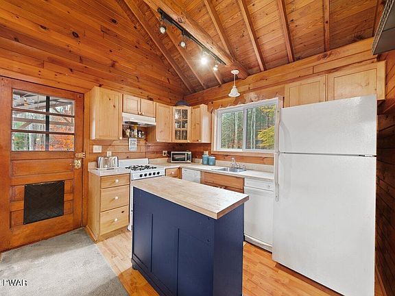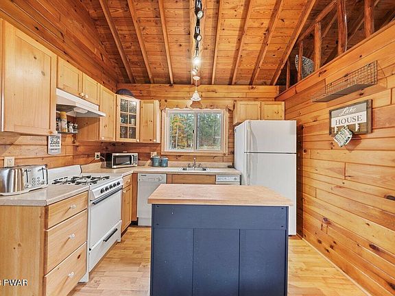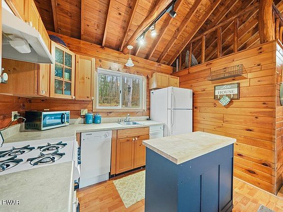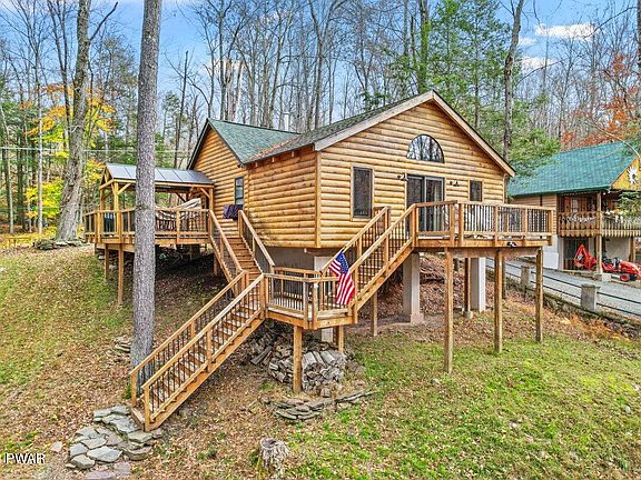 A TRUE TURN-KEY OPPORTUNITY! This three-season log home comes FULLY FURNISHED inside and out, with views and easy access to the lake without the lakefront price making it a no-brainer for your very own personal getaway or SHORT TERM RENTAL potential! The private Beechwood Cove community is situated in the back of the cove, not far from the popular Ironwood Point recreation area/marina. The calm, peaceful water of the cove is just what you are looking for if you prefer relaxing waters or head into the heart of Lake Wallenpaupack. Here, you can safely swim to your community's swim dock, kayak from the private beach area & secure your boat or watercraft in your very own boat slip. Other features: Brand new washer & dryer, kitchen island, gazebo is 1 year old, new bathtub, all new beds, shed is 2 years old, Blackstone griddle is 2 years old, buried dog fence along the perimeter. Enjoy the view of the lake from the front deck or the sounds of the creek on the side deck, rain or shine w/your built-in pergola. Picture yourself under the starry night sky, gathered around a crackling fire, sharing stories and toasting marshmallows. The fieldstone patio, complete with a built-in fire pit, is the ideal spot for your gatherings & celebrations. This home comes with an exhilarating surprise - your very own zipline! The zipline is not just a unique feature; it's a source of endless fun and excitement for all ages, ensuring you'll never run out of things to do right in your own backyard. The community is extremely welcoming, inviting, and holds annual picnics & community events so grab your bathing suits and jump into this amazing opportunity!