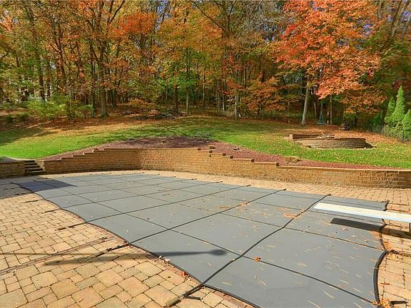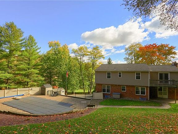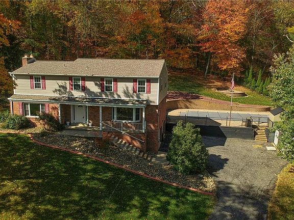 Picturesque 0.70 acre treed setting in Peters Twp.; spacious 2 st Colonial with outstanding amenities; covered front porch; inlaid tile floor in foyer, bay window in living room; formal dining room; beautifully updated kitchen (2015) w/newer appl, granite ctrs and Timberline cab in Cognac; cozy family room hosts fireplace, beamed ceiling and doors to yard; French doors to private deck from master with adjoining den/bedroom 5 w/built-in cabinets; remodeled master bath with double sinks and tiled shower w/luxury multifunction shower spray; updated hall bath and 3 additional bedrooms on second floor; laundry w/sink; newer windows, new carpet on steps to second floor and all bedrooms & closets on second floor; newer blinds on second floor; basement waterproofed; newer roof, siding, shutter, retaining wall, hand railing; great outdoor recreation w/large brick fire pit patio & inground pool w/diving board; fenced yard backing to trees; easy access to parks and Rt 19; 35 min to Pgh or Airport