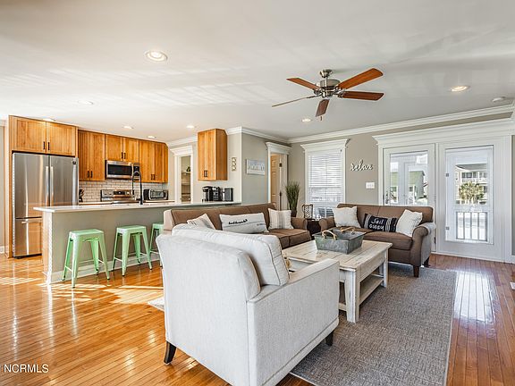 This 4 bedroom, 3.5 bath home has absolutely stunning views of the Intercoastal Waterway and close to beach access. You are greeted by a large covered front deck. As you enter this lovely home you immediately are taken in by the soothing colors and light filled rooms. The open floor plan features a living room, dining area, kitchen and half bath. The recently remodeled kitchen has new quartz countertops, new SS refrigerator, electric stove, built-in microwave and backsplash. The kitchen island features a sink with plenty of counter space. The natural wood cabinets compliment the decor throughout . The primary bedroom is large and sunny with connecting bath. Venture up to the second floor and relax in the loft area with door that leads out to the upper covered deck. Three more bedrooms, one a bunk room, and two baths give you plenty of space for family and friends. Enjoy sitting on any of the three decks to enjoy all the views and serenity of being at the beach. The outdoor shower features hot and cold water. As part of the amenities of the HOA there is a gated dock and pier to enjoy being out over the water and watching the boats go by. This property has been a rental with proven rental history. Don't miss out on making this house your home!