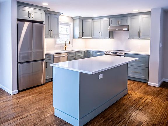 Welcome home to 123 Cowesett Rd! Located just a few minutes from Main St East Greenwich this home has been thoroughly updated throughout. The main floor features a brand new custom designed kitchen complete with island, stainless steel appliances and quartz on both the countertops and backsplash. Off the kitchen you'll find an oversized living space ideal for entertaining. Plenty of space for both living room and dining areas as well as a slider that walks out onto a multilevel deck that walks down to a brick patio. The first floor also comes complete with refinished hard wood floors throughout, three bedrooms and a renovated bath. The bathroom features pebble tile accent wall in the shower and a double bourbon vanity with matching pantry closet for extra storage. Down stairs you'll find two additional bedrooms with an ample size family room complete with wet bar, wine racks and beverage center. Downstairs also features an entirely renovated full bath with a stunning herringbone sage grey shower. This home also features an attached garage with additional office space. Other updates include all new windows, brand new central air system, updated electrical panel and new hot water heater. All of this and more help make 123 Cowesett a must see!