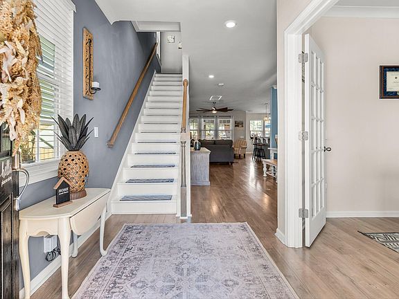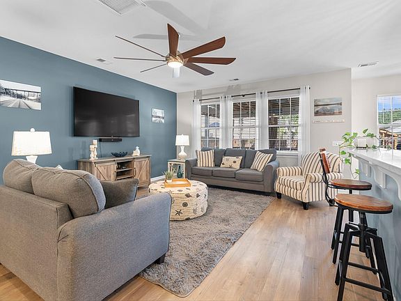 You will love the spacious open floor plan in this large, beautiful home with plenty of room for everyone! The bedroom on the first floor is great for guests and the bonus room on the third floor makes a great game/movie room for everyone to enjoy. This home has laminate flooring throughout the living spaces downstairs with tile in the baths and laundry. The kitchen has upgraded gray cabinets and quartz countertops with a white subway tile backsplash. Enjoy the upgraded Kitchen Aid dishwasher and gas range as well as a Fridgidaire refrigerator.The centerpiece of the back yard is the gorgeous saltwater pool that is heated AND cooled as well as a hot tub to enjoy. The pergola, which conveys, adds additional entertainment space along with the different seating areas offered by the expansive pool deck. On top of that, the extra large screened porch is a great space for outdoor dining. Enjoy the 6 beautiful palmettos added to the property for an island vibe. The current owners also added a French drain around the exterior perimeter of the back yard. Smart home features such as an Amazon Alexa Puck, Ring doorbell and smart lock on the front door convey as does a small shed on the side of the home. This house has everything you need for cozy living with a wonderful surrounding interactive community all around you including regular food trucks at the community pool. This home checks all the boxes. Beautiful, move in ready with numerous upgrades. You can enjoy you very own serene oasis.