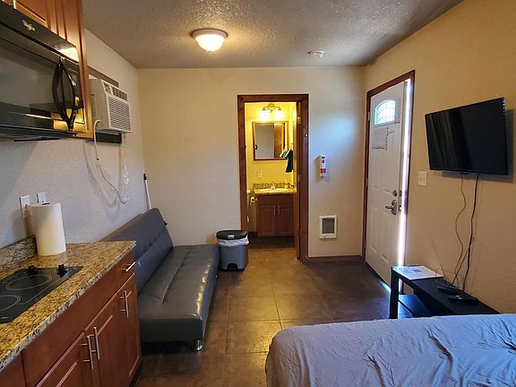 No matter the reason for your visit to the Old Pueblo, this cozy well equipped studio is waiting for you. This cute studio offers, cold A/C for our extra warm summers, comfortable full-size beds with fresh linens, relax to a bit of binge watching on the smart TV which is connected to the Wi-Fi for favorite streaming shows, cook something up in the equipped kitchen. Enjoy near access to restaurants, shopping, entertainment or take a short drive to an array of activities under the sunshine. All utilities included (electric, water, & Wi-Fi). We offer weekly $293.50 rental rate + $100 deposit + $55 cleaning fee, Bi-Weekly $550 rental rate + $250 deposit + $55 cleaning fee, or Monthly $750 rental rate + $750 deposit + $75 cleaning fee. This is a furnished unit with cold A/C, full size bed with linens, Kitchenette with all essential cooking items, bathroom with clean towels, smart TV and Wi-Fi to connect gadgets. Unit is located in small quiet community with 3 other units, near restaurants, shopping, entertainment and much more. Walking distance to public transportation.