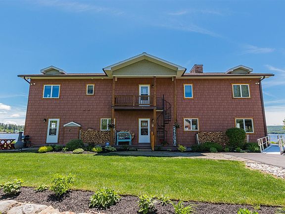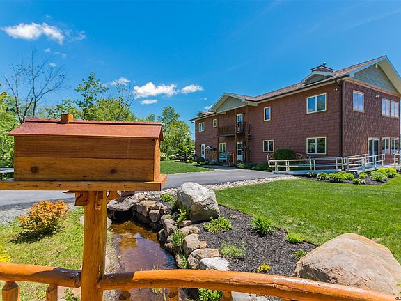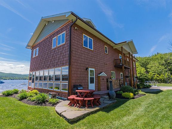 Immaculately maintained custom home on 200'+ lakefront w/floor to ceiling windows offering panoramic views from every room! Open floor plan, granite & stainless kitchen, mstr w/heated floors, enclosed & in-floor 8+ Caldera spa, natural wood walls, flooring & tile throughout. Upstairs includes lg office w/high speed fiberoptic, kids' entertainment area, reading loft, private nursery off one of 3 BRs and a bunk room w/9 custom log bunks. 30x40 garage features boat storage, gym and 2 cars along with a finished second floor playroom. Property includes lg grass yard, mature English-style flower gardens, flowing creek & beautiful trees at the end of a quiet street less than a mile from shopping/dining, CampoftheWoods & Oak Mtn Ski Ctr-designed to take advantage of all the ADKs offer yr round!