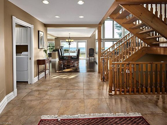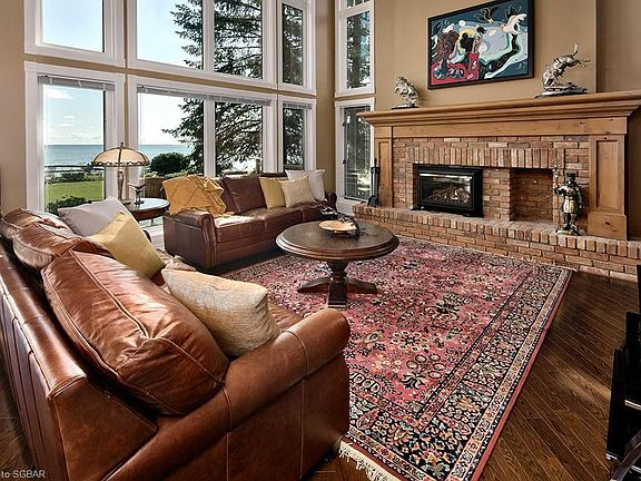 Welcome to this stunning 5-bed, 4-bath waterfront home on a tranquil court w the best view in town. Enter the front foyer from the wrap-around porch & take in the expansive open concept main floor. The Great Rm boasts a majestic gas fireplace, soaring cathedral ceilings & tall windows embracing abundant natural light. A spacious Kitchen features cherry cabinetry, granite counters, large island, stainless steel appliances & 2 separate sink areas. 2 sets of sliding doors lead to backyard wrap-around deck, ideal for entertaining or sipping morning coffee, enjoying Georgian Bay sunrises & blue waters. Features of this home incl: direct access to beach, hardwood floors, large bedrooms, Master Ens with soaker tub & glass shower with rain-shower faucet & body jet sprays, spacious main floor Office, main floor Laundry Room with entrance from garage & deck, ample closet & storage space, finished basement with Rec Room & 5th bedroom, video security system, & 17-kw Generac generator.