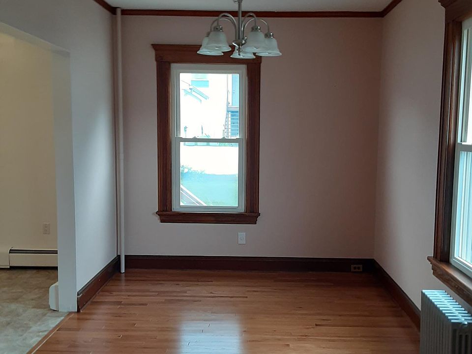 Immaculate, freshly painted, updated 1st floor unit. Features include new kitchen floor, backsplash, SS appliances. New hardwood floors in Living room, Dining room & bedroom. New light fixtures, W/D hookups in basement along with storage. Rear deck and backyard. Driveway parking for 2 cars + 1 garage space. No pets, Non-smoking. Heat is included. 1 month rent, 1 month security, 1 month realtor fee. NTN credit report, income verification.