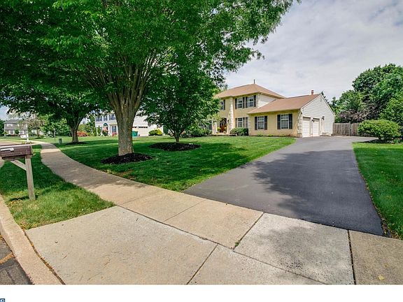 Beautiful, updated, and well-maintained North Wales 4 bedroom colonial with finished basement and pool on a tree-lined cul-de-sac. Convenient location for commuting, shopping, and recreation. All flooring on main & upper levels installed in 2014 with wide plank espresso hardwood floors in foyer, island kitchen, and dining & family rooms. Nice trim work throughout. Eat-in Island kitchen with granite countertops, tile backsplash, stainless steel appliances, gas cooking, and pantry. Adjacent family room features vaulted ceiling, skylights, a bar, gas fireplace, wired for surround sound & powder room. Foyer entry with coat closet, living & dining rooms, office with double doors, and laundry/mud room with sink complete the 1st floor. 2 sliders open onto a new deck (2016) overlooking a large fenced-in yard with an in-ground pool with jetted hot tub. Master bedroom with ensuite bathroom (dual vanity, shower, jetted tub), dressing area, ceiling fan, and walk-in closet with organizers. 3 additional bedrooms (larger ones have ceiling fans) are served by hall bath with dual vanity. Finished Basement (not included in SF)(2016) features upgraded carpet and recessed lighting (2016), abundant storage and cedar closet. 2-car garage with inside access and plenty of parking. North Penn school district. Schedule your preview today!