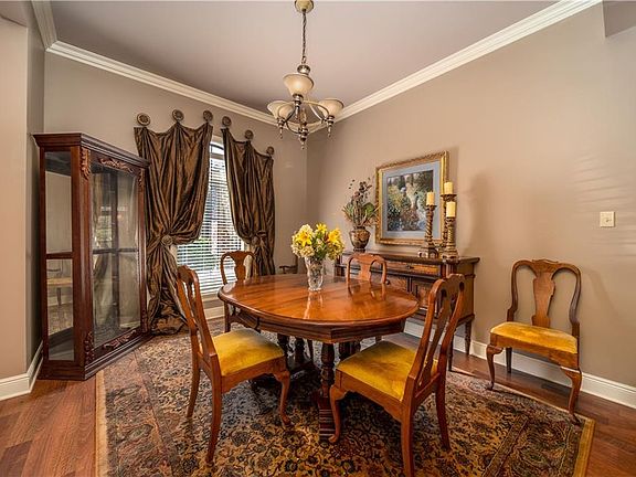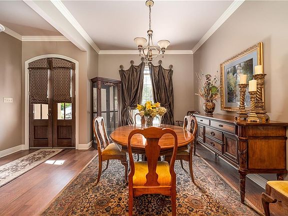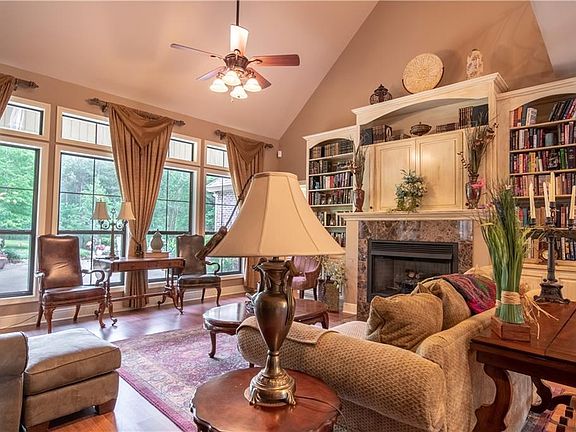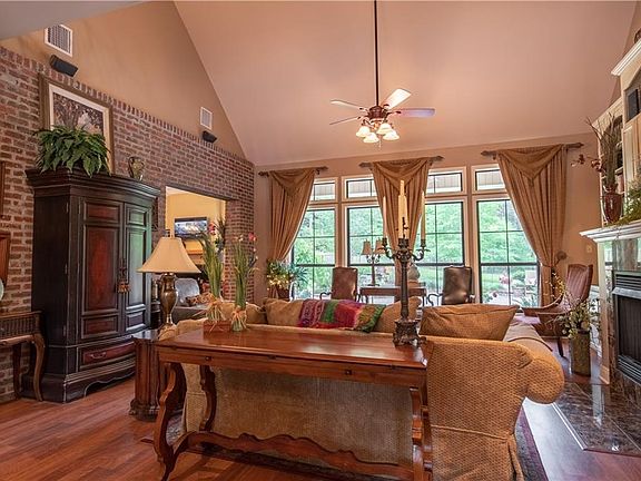 Impressive country estate minutes from shopping, schools, and churches. Home was custom built and sits on hilltop on 3.75 acres of private woods and manicured lawns and gardens! Stunning architectural features include soaring ceilings, custom shelving in living room, decorative wrought iron railing in upstairs gathering room, window blinds throughout and custom window treatments in the living areas. The spacious living room also has impressive brick and beam accent wall. The expansive kitchen has huge island, lots of surface area, and brick alcove for the cooktop. A breakfast area, a walk-in pantry, and keeping room with fireplace complete the kitchen space. A spacious office is adjacent to the kitchen. There is a triple garage and ample parking space in front of home. Lots of windows so you can enjoy the outdoors and a charming (but big) patio allows you to relax and unwind with nature's beauty.