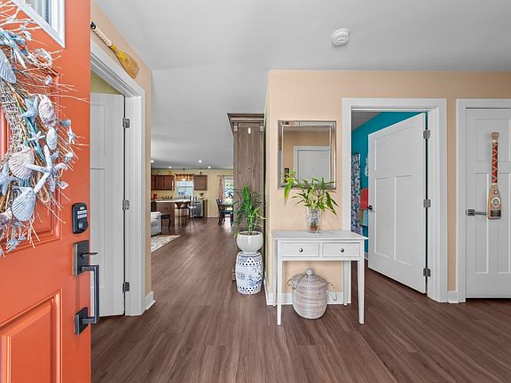 You’ll fall in love with this charming ranch-style home that beautifully combines modern convenience and cozy comfort, nestled in a lovely community with an easy drive to Virginia, Elizabeth City, and the Outer Banks. As you enter, a warm foyer welcomes you into an airy open-concept layout with stylish seamless LVP flooring that flows seamlessly through the living room, dining area, and kitchen—great for entertaining guests. The kitchen shines with stainless steel appliances, a roomy pantry, and a charming island with a sit-at bar, perfect for casual dining. One of the standout features is the brand-new custom 15’ x 19’ covered deck right off the dining room. This outdoor space, complete with a fan for comfort, is perfect for relaxing or hosting gatherings in your spacious yard. The Ensuite bedroom offers a private retreat, complete with a generous walk-in closet and a stunning stand-up shower with a double sink vanity. For added convenience, there’s a laundry room with ample shelving for storage needs. This well-maintained home also includes service contracts for HVAC, garage doors, pest control, and bi-annual power washing. Key updates include new LVP flooring throughout, a new dishwasher, a covered deck, and upgraded garage flooring. The two-car garage features custom epoxy flooring and provides a dry entry into a welcoming foyer. Just a short stroll away, you’ll find the beautiful Shingle Landing Park, offering a playground, walking paths, a gazebo by the pond, a pavilion with restrooms, and three Pickleball courts. There’s also a nearby boat launch area with parking, perfect for outdoor adventures. The HOA takes care of the landscaping, ensuring a pristine outdoor space with weekly lawn care from March to November, including mowing, trimming, mulching, and fertilizing and trash removal. This home truly is a treasure!