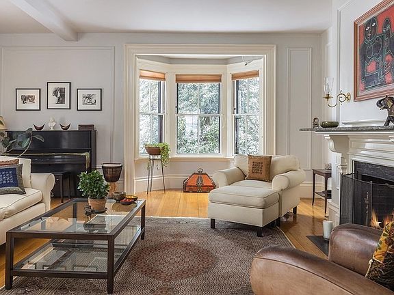 In wonderful High Street Hill neighborhood this Second Empire/Mansard Roof style offers capacious rooms and 10' ceilings, beautiful staircase, period details on 1/2 acre of level land. Entertaining space in LR, DR (with fireplaces) and large entry hall. Large comfortable family room/library. Good circular layout. Original butler's pantry leads to kitchen with dining nook, pantry and mudroom. DR opens to porch and beautiful private yard with perennial flower beds. Second floor has 4 Bedrooms, office, 4 baths, and a back staircase great for guest suite/ au-paire space. Third floor has 3 charming BRs and lg. renovated bath. A carriage house can hold two cars, plus storage room, and stairs to raw loft space with skylights and dormers.Large level grounds surround home with mature evergreens, dogwood, rhododendren and a rare Silverbell tree. Pill Hill offers easy access to Village, MBTA, Brookline and private schools, Med. area, universities and Downtown Boston and the Emerald Necklace.
