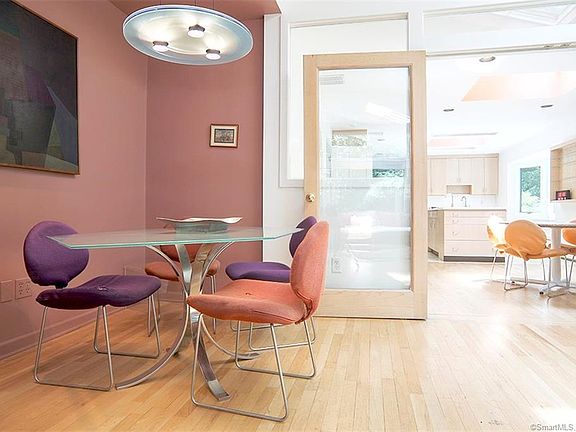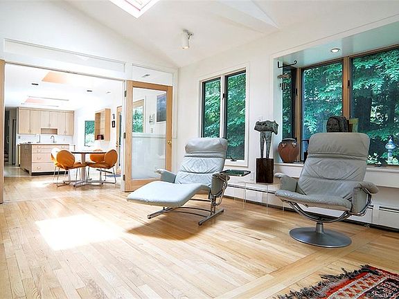 Looking for an oasisconvenient To everything? This contemporary ranch with river views and access to the Mianus River Park trails is a private oasis yet convenient to downtown, area schools and parks! Located on a desirable cul de sac it features a great room with cathedral ceiling and walls of glass that bring inthenatural surroundings. The spacious eat-in kitchen with bay window flows into the great room and has a large center island, great cabinets and counterspace,and access to a side patio.The large master suite on the main floor has lots of natural light,a large walk-in closet and bath with double sink vanity, bathtub, shower and linen closet. There is also an adjoining room that can be used as a study, nursery, or sitting room. The spacious living room off of the main foyer features ahigh ceiling, bay window and fireplace.The 2nd bedroom on the main floor hasdouble closets and sliders to the outdoors. The lower level features a family room with fireplace and French doors leading to a backyard patio with views of the river. There is a 3rd bedroom on the lower level with double closets, and a possible 4th bedroom, office, or room for an au pair. The one acre property is beautifully landscaped and provides a tranquil, natural setting.