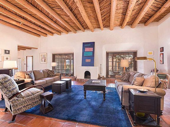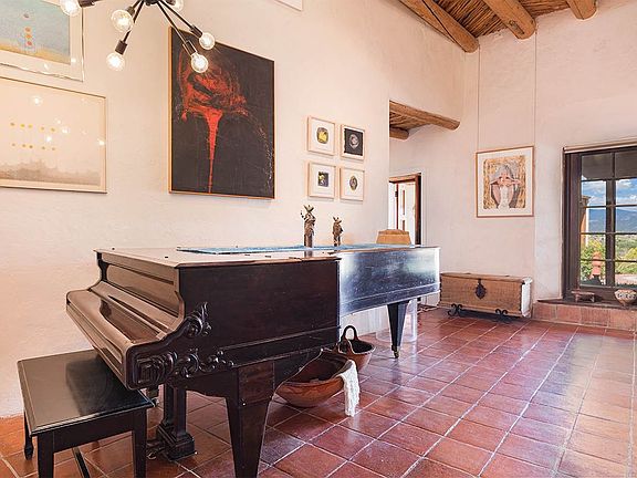 A magnificent 2 bed/2 bath, 2388 sq ft adobe hacienda with a detached 1 bed, 658 sq ft adobe guesthouse and a 447 sq ft adobe studio sitting on 2.2 acres along the Llano Quemado ridge, overlooking the Ranchos Valley. For sale for the first time, this modern classic started as an adobe family home for the Romero family dating to the late 19th century. The midcentury modernist painter R.C. Ellis and his gallerist wife Rosa Ellis made it their home in 1964 adding the magnificent great room, converting an old tack room to his studio and adding the guesthouse in about 1968. With softly sculpted, 18 inch, double thick adobe walls, tile and polished-brick floors, 6 interior kiva fireplaces, vigas, split cedar ceilings, divided light windows, nichos, and hand-made doors and a central courtyard this magnificent one-of-a-kind home is anchored by a dramatic sala (with its 1874 Steinway Concert Grand owned by Andrew Dasburg) that was the setting of many a soiree and musical evening for artists and luminaries of the era. Upgraded with on-demand water heaters and electric baseboard and propane powered forced air heat, this home awaits a new owner who will relish the expansive views, irrigate the pasture land and fruit trees and bring new life to the gardens and courtyards of this classic northern NM home. Kiva fireplaces in the living, dining, main bedroom, guest bedroom, guesthouse, studio and east courtyard.