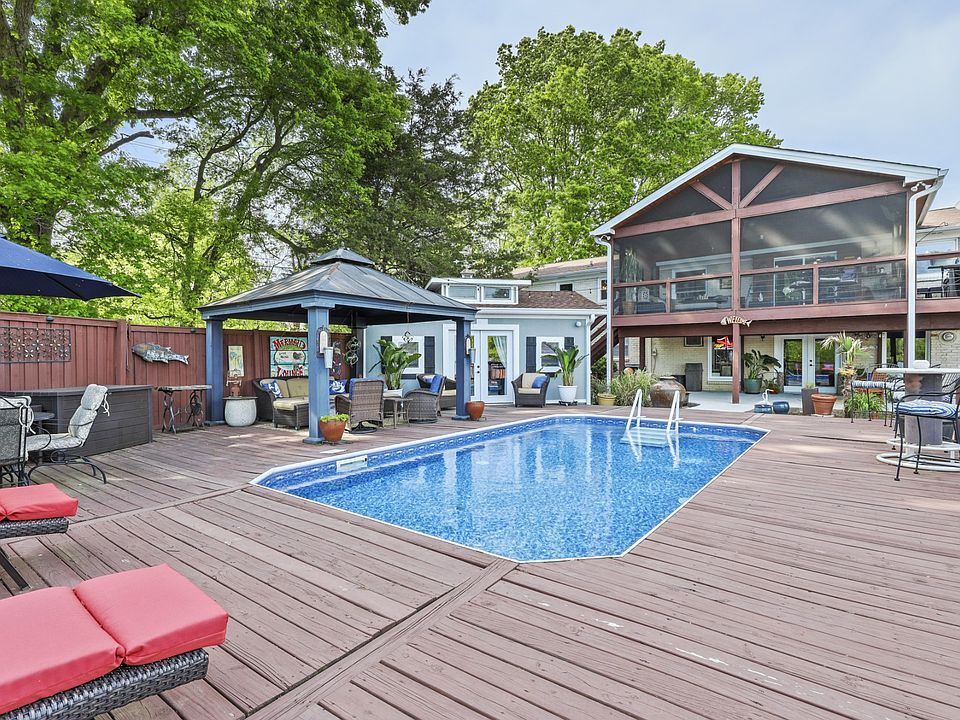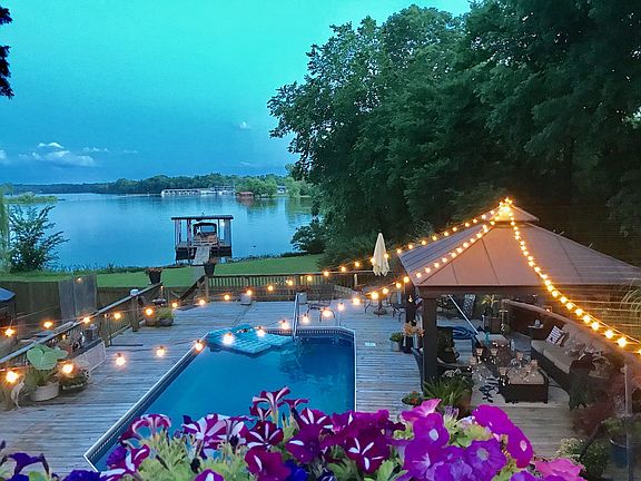 This charming and eclectic home will capture you when you walk in the door. Open floor plan provides amazing views of the lake. The kitchen is expansive and provides plenty of cabinets, gas cooktop, counter tops and island. LVP floors are through main living area and bedrooms. The screened in deck off kitchen has a vaulted ceiling and a view that is unlike any other. Primary suite is a great place to unwind and features an adorable bench seat to curl up with a good book. Lower level reveals a spacious rec room with a kitchenette and full bath while providing access to the inground pool, pool house and so much more. Boat dock has electric. Another nice feature is a whole home generator (see update list). Don't forgot to watch the video with drone. Cash or Conventional only.