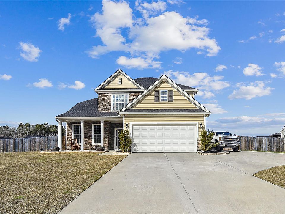 Located in a charming new community, this rare property offers the tranquility of the country yet provides all the city comforts close by. This 2019 home awaits on a sprawling .69-acre lot nestled in the highly desired Cooper Estates - located close to I-26, Lake Moultrie, Cane Bay Plantation dining & shopping as well as Nexton. Looking to entertain? Your guest will admire the openness & grand feeling of the main living space with lofty ceilings. They'll have more than enough room to gather inside & out. Your backyard is fully fenced for privacy & will make the perfect place for celebrations, maybe a pool if you'd like & of course your four-legged family members. Have an RV? There's a special space to park and hook up to your own 50 AMP service.Upon arrival, you'll find a beautiful home with great curb appeal, a large lot with plenty of room between your neighbors, ample parking, and handsome stonework adorning the facade. Your front porch with greets you with columns and space for plenty of rockers - it will make a great spot for sipping on your morning coffee or unwinding with an evening glass of wine. Once you pass through the front door, you'll notice a proper foyer featuring luxury plank flooring, tray ceiling detail, and a neutral color palette that runs throughout the entire home. Immediately to the left, you'll find a spacious, formal dining area and to your right, access to the laundry room which features optional cabinetry, and access to the two-car garage. Continue straight ahead and prepare to be impressed. Enter the main living space where the ceiling height soars to give this great room an airy and bright feel. This is where you'll find the kitchen, eat-in kitchen area, sun room as well as the living room. This spacious great room is anchored by a lovely fireplace that will fill the room with warmth during the cool holidays. It is also wired and equipped with surround sound sub. The cook in the family will be pleased with the amount of storage in the beautiful cabinetry and pantry. The spacious island with classy granite stone will likely serve as the heart of the home - naturally gathering family and friends. Other highlights of this gorgeous kitchen are the stainless steel appliances, tons of can lighting, an under-mount sink, pendant lighting, and glass cabinet detail. The owner's suite is just around the corner from the main living area as well as a perfectly convenient powder room. Your retreat is spacious and includes a tray ceiling, large window, ceiling fan, and en suite. Your private bathroom has double sinks, granite countertops, tile floors, a water closet, a linen closet, tile surround soaking tub, and glass surround walk-in shower with floor-to-ceiling tile. The walk-in closet is a great size. As you make your way up the stairs, notice solid wood treads. The spacious loft has a view of the great room below and makes the perfect space for an office or play area. Two secondary bedrooms and a full bath are also located on the second floor. The two bedrooms both have ample natural light and are fairly spacious for secondary bedrooms. The bathroom features a large bathroom cabinet with a tub/shower combo, tile floors, and a great transom window. Out back, almost half an acre of your land is surrounded by a privacy fence. Oh, the possibilities! With access through a double glass sliding door from the sunroom, the patio and deck extension are ready for your outdoor furniture and perhaps a firepit and grill. You'll easily move any outbuildings into the backyard through the double gates leading from the driveway extension. Please note: The shed and play-set do not convey.