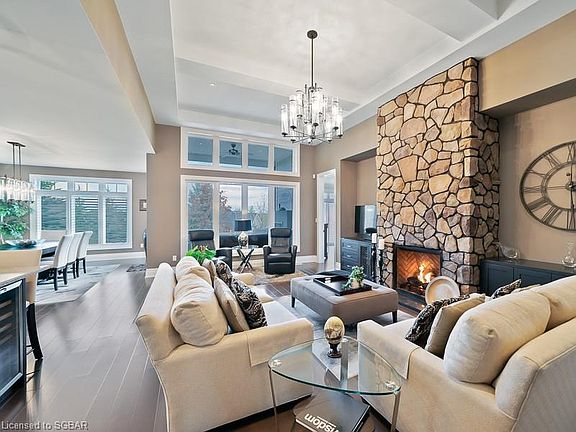 Beautiful 4 bed home in the prestigious Lora Bay community. Featuring numerous high end finishes throughout, plenty of entertaining space, seasonal bay views and just a few minutes from downtown Thornbury. The open concept main floor boasts high coffered ceilings in the living area, california shutters throughout, wood floors and an open plan kitchen/dining with built in ovens, quartz countertops, wine fridge, garburator and island with seating. The living area features a stone surround gas fireplace, large windows that let in lots of light and walk out to the back deck. The main floor master suite offers a walk out to the deck and hot tub, 5pc ensuite bath with 1 way window for complete privacy and large glass surround shower with built in bench and his and hers walk in closets. You'll also find an office/den, guest bedroom, 3pc bathroom, laundry room with custom cabinetry and mudroom with access to the 2 car garage. The lower level is fully finished with a rec room, modern electric fireplace, oversized windows, 4pc bathroom, 2 good sized guest bedrooms and ample storage space.The ideal area for guests! Outside has been designed for true outdoor living featuring a covered porch area with stamped concrete floors and fireplace, deck with glass railings, hot tub, gas BBQ and extensive landscaped gardens. Located minutes from Downtown Thornbury and its award winning dining, boutiques and harbour and a short drive to the area's private ski and golf clubs! Move in and enjoy all that Lora Bay has to offer including golf, restaurant, social activities, 2 beaches, recreation centre and much more. Covid 19 protocols in place.
