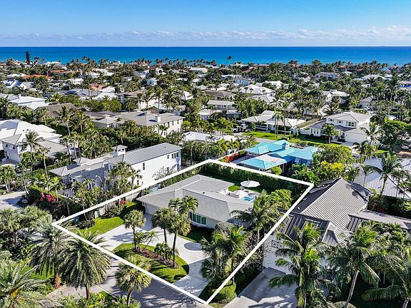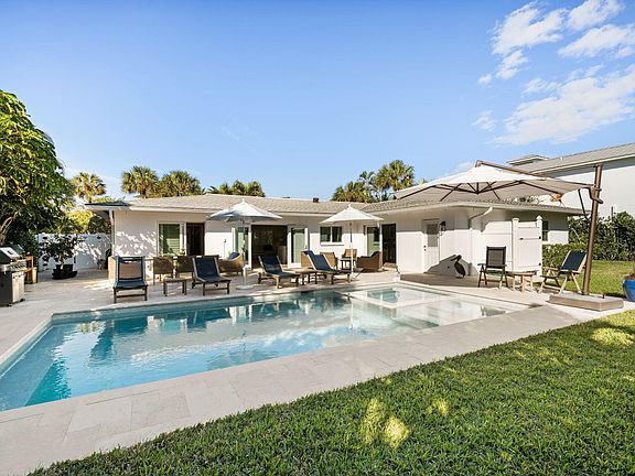 This tastefully renovated 3-bedroom, 2-bathroom beach home in one of the best locations within Jupiter Inlet Colony is meticulously maintained and offers a tranquil beach-style living experience. Possible SELLER FINANCING or lease purchase available. The home is situated on one of the larger lots & highest elevation in JIC with a circular driveway and is just steps away from the beach. Inside, the home features impact doors and windows, an open floor plan that allows plenty of natural light to flow through, and porcelain beach tile flooring. The kitchen boasts quality white wood cabinetry, quartz counters, and stainless steel appliances, creating a modern and stylish space. The bathrooms have also been nicely updated. Outside, the home offers a large, new salt water heated pool and spa..