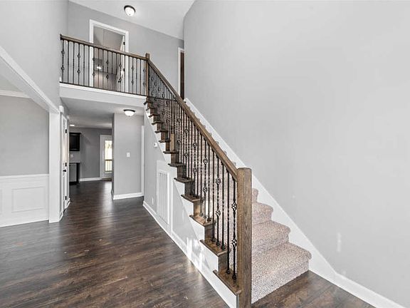 Open floor plan with vaulted foyer lends a bright and airy feel on the main level. Kitchen with large island is open to the living room. Formal dining room and eat-in breakfast nook, complete with three bedrooms and large laudry room on second level. Master with TWO walk-in closets, soaking tub and full tile shower! Front covered porch AND covered back patio, plank rustic flooring, subway tile,slate appliances & shiplap fireplace.