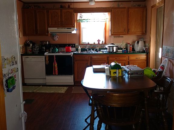 Large corner lot with vinyl sided 2 bdr, 2 bath home with eat in kitchen with appliances,laminated floor, laundry room, mudroom, livingroom, heated with oil, detached 2 car garage with storage and coal furnace
