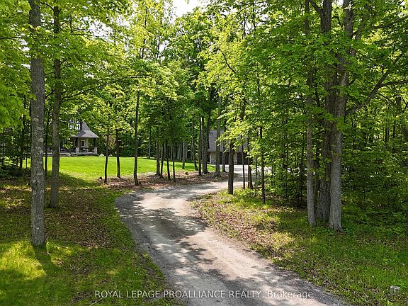 Tucked away at the end of a quiet dead-end road, this custom-built home sits on nearly 1.5 acres surrounded by forest, open fields, and fresh country air. A tree-lined driveway leads to a welcoming front porch, the perfect spot to relax and take in the peaceful setting. Inside, an impressive great room with vaulted ceilings and a hand-laid Nova Scotia stone fireplace creates a warm and inviting focal point. The spacious kitchen is designed for entertaining with a large peninsula, stainless steel appliances, and plenty of cabinetry. A cozy second living area, dedicated office, and convenient powder room complete the main floor. Upstairs, you'll find three generous bedrooms, including a primary suite with a walk-in closet and spa-inspired ensuite with double vanity and glass shower. The expertly finished lower level adds exceptional versatility with a beautifully appointed in-law suite featuring a full kitchen, living room, large bedroom with walk-in closet, and a luxurious bath. Step outside to enjoy a spacious deck with tranquil views of trees, trails, and open land. A fully insulated and heated double garage is ideal for a workshop, storage, or year-round hobbies. Additional highlights include an efficient gasification wood boiler system with electric backup heat, and central air, updated 2 years ago. Offering a true sense of retreat while remaining a short drive to Stirling or Marmora, this exceptional property is ready to welcome you home.