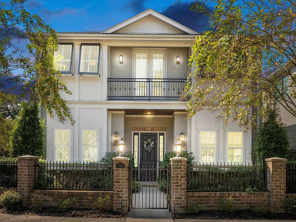 Stunning French Colonial inspired home nestled on a corner lot within the prestigious gated community of Marion. Throughout the home, updated lighting and custom wallpaper showcase the designer's attention to detail. The inviting entry greets you with a charming sitting area featuring built-ins and a dedicated office space on either side. Entertainment flows naturally with a bar complete with custom wallpaper and beverage fridge. The living room captivates with its exposed brick wall and gas fireplace. The upgraded kitchen showcases premium Wolf cooktop, Sub-Zero refrigerator, and farmhouse sink. Retreat to the primary bedroom, beautifully adorned with designer wallpaper and a private balcony. The ensuite pampers with a soaking tub, separate shower, and spacious walk-in closet. Three additional bedrooms upstairs, each with ensuite bathrooms and a game room. Practical luxuries include water filtration system, water softener, and three-car garage.