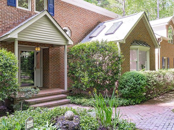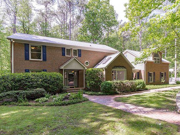 A private garden oasis welcomes you to this stunning stately brick two story home with quality updates and a light, bright feel. Every window presents a gorgeous lush view of the property. You feel like you are in a peaceful and private retreat. Open in the main gathering spaces with abundant light, vaulted ceilings and skylights everywhere! Looking for a separate home office with french doors? Main floor primary bedroom suite? This home has it all. Gorgeous cherry cabinets, stainless appliances, breakfast bar with a bay window view in the Kitchen. Separate Family Room leads to the large private Deck. Don't miss the hidden stairway to the huge Bonus Room perfect for a second home office/exercise space/playroom. Second Floor Loft space overlooks the Living Room. Hardwoods in most rooms. You will want to allow extra time to explore the meandering paths, trickling pond, fire pit, shed that lead to an incredible separate outbuilding with loft and powered workshop/studio space. It even has a covered porch. Extremely well maintained and solidly built home. Newer Roof, HVAC, Carpet, Interior Paint. Chapel Hill schools.