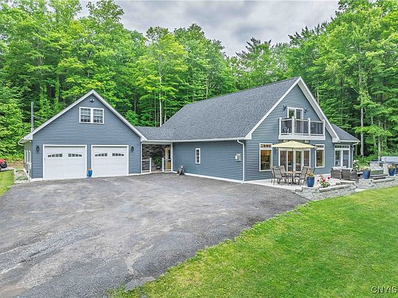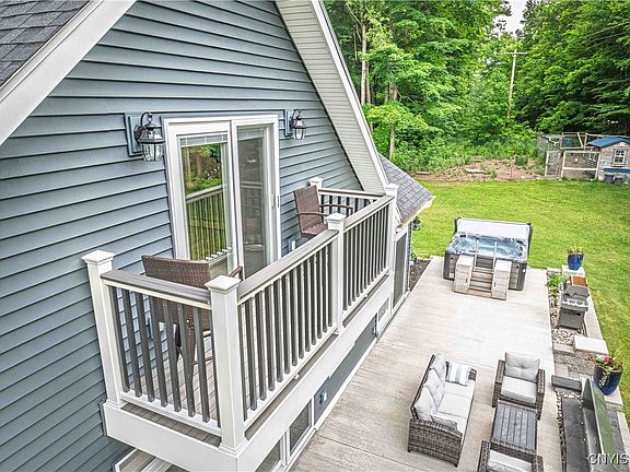 Built in 2018 and thoughtfully expanded in 2023 with a private 1-bedroom in-law suite, this 3,000 sq ft home blends modern comfort with timeless style. Step into an open-concept living space featuring a completely modern kitchen with sleek quartz countertops, and in-floor radiant heat. Enjoy surround sound with a fully wired speaker system in living room, kitchen and outdoor patio.. The sun-drenched three-season sunroom opens to a beautifully landscaped backyard oasis, complete with an 8-person hot tub and breathtaking river views, and a custom-built fireplace perfect for cozy evenings .The primary suite is a true retreat with a private balcony overlooking the water, a large walk-in closet with custom built-in vanity, and en-suite bathroom. Heated and cooled 3-bay garage.Expansive 2-acre lot with room to roam and relax. Just a 20-minute drive to the new Micron site and 20 miles to down town Syracuse.