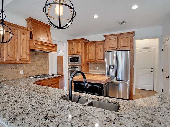 This beautiful Medicine Park Home will feel more like vacation than anything else! It is nestled in a stand of oak trees and features views of the mountains. The backyard is an oasis...a great place to relax and recharge with large trees, a wooden privacy fence, large covered patio, an open flagstone patio and beautiful grass! The interior of the home is gorgeous with plush specialty carpets, wooden floors, and gorgeous ceramic tile! The kitchen is well appointed with a gas cooktop, decorative vent hood, center island and microwave, nice refrigerator and granite countertops! There is an eat-in kitchen area, as well as a breakfast bar. The laundry room is tucked away behind the kitchen for convenience. Two bedrooms are located privately down a hallway with a Jack N Jill bath just off the kitchen area. The spacious owner's retreat is opposite the living area from the other two bedrooms. The owner's primary bedroom is oversized with gorgeous carpet, a large walk-in shower, whirlpool tub, double vanity and a walk-in closet. The front door opens into a spacious living area that features a floor to ceiling stone fireplace that is wood burning with a gas starter, and large windows overlooking both the front and backyards. There is also an extra room at the front that could serve a variety of purposes such as a home office, formal living area, or a play room. There is a private bath adjacent to this extra room. This rustic beauty is just gorgeous! Your home could be your spa and retreat! Call Kim to schedule your tour today, 580-704-9916.