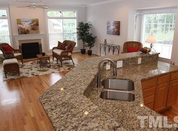 End unit townhome. Move-in ready. 2446 square feet. Open floor plan with gorgeous hardwoods & natural light. Kitchen with granite & integrated sink, pantry & breakfast bar. Family room with built-ins & gas fireplace. Formal dining room. Owner suite with cathedral ceiling, walk-in closet, tub/separate shower, granite. Third floor bonus or bedroom with 2 walk-in closets. Private, fenced patio.Walk to optional pool/tennis club. Miles of walking trails. Short stroll to Market Street shops & restaurants