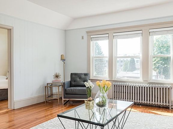 Located a short distance from Cabot Park and the under construction Cabot School, this lovely sun splashed top floor unit has much to offer. The large living room has beautiful period detail and elegant wood paneling. The three bedrooms are a nice size with unique and charming storage spaces. The unit can be used as a two bedroom if you would like a formal dining room or a three bedroom with a dining area. The kitchen has been recently renovated with S/S appliances and granite countertops. The over-sized back deck leads out from the kitchen with views of the common back yard. Plenty of windows throughout and tons of storage. Laundry in unit, 2 off-street parking spaces and storage in the basement are additional features. Conveniently located near the Commuter Rail, Express Bus and other buses, Newtonville Square, shops, restaurants, highways and other transportation.