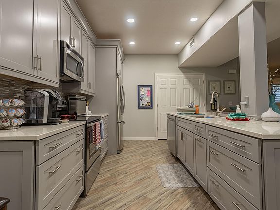 Beautifully updated 2 bedroom- 2 bath, walk in level condo- features include vinyl plank flooring, solid surface countertops, newer soft pull cabinets, electric log fireplace, paint and more. This condo feels like a home with no neighbors upstairs, a private entry and a assigned parking space. The unit comes with all of the appliances and comes furnished minus a few personal items. The split floor plan and open concept adds to the charm. There is a also a nice patio area off the living room and bedroom that add a great outdoor space to enjoy. The gated neighborhood of Palace View Place is a great community neighborhood with no nightly rentals allowed and offer a clubhouse and pool,