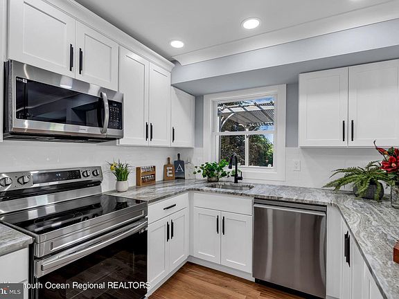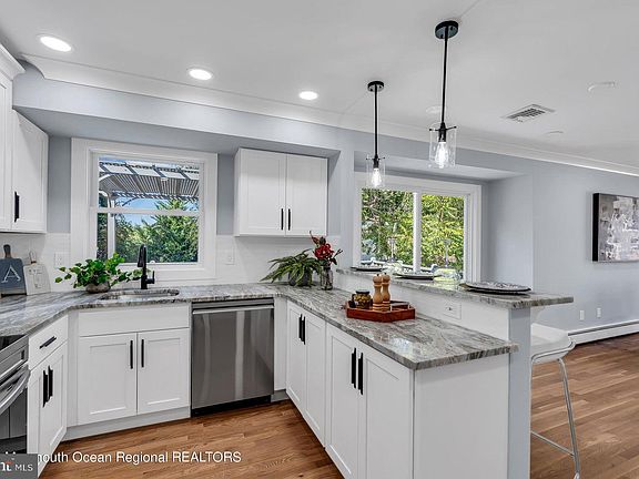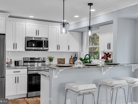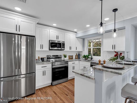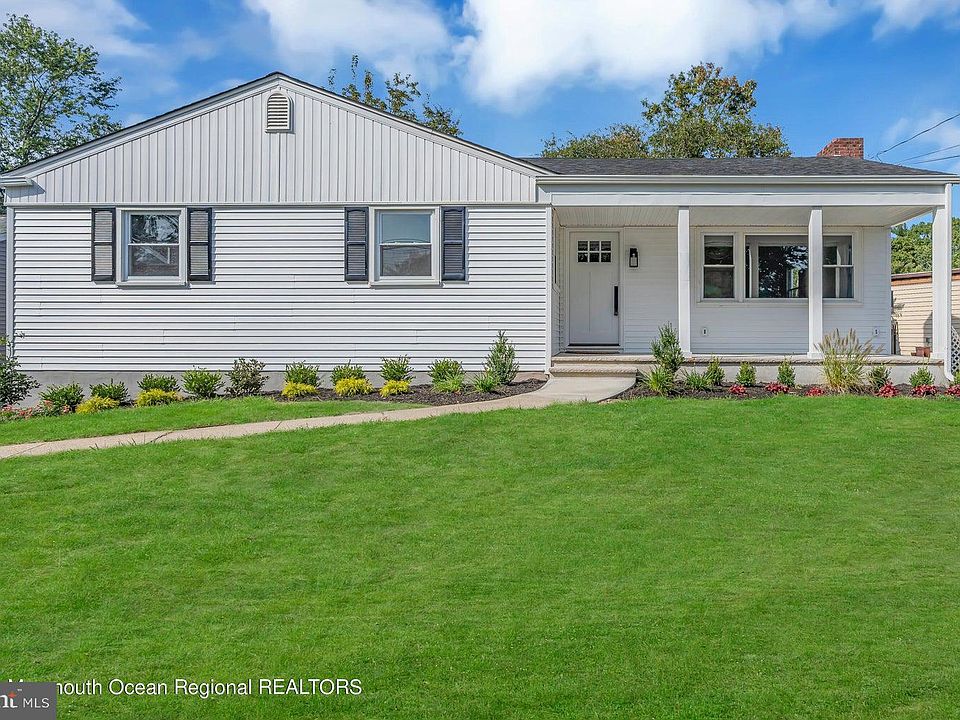 Great Shark River Hills Location! Just move into this remodeled 3 Bedroom 2 Full Bath Ranch with Full Basement that's only minutes to the Beautiful Beaches of Belmar and the rest of the Jersey Shore. Quality renovations features white shaker kitchen with granite countertops with built in breakfast bar, stainless steel appliances and recessed lighting with sliding door leading to elevated deck. Custom molding throughout the home all accented with hardwood floors on the upper level. Home features morning southern exposure in living room and dining room giving bright sunlight throughout the day. Upper level fully renovated bath with ceramic tiled tub surround. Downstairs your finished basement features family room with raised hearth fireplace with walk out leading to patio and outside back yard. Many new amenities to home include new roof, new tilt wash windows, new asphalt driveway, front porch and vinyl siding on front exterior of the home. Not to mention all the new doors, trimwork and interior update of the home.