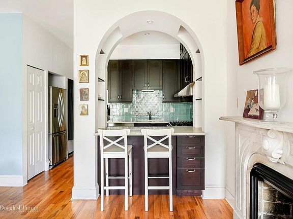 Located in a nicely maintained five-story brownstone on a beautiful tree-lined block near the border of Park Slope and Prospect Heights, this renovated two-bedroom apartment has all of the comforts you need to make it your home. The apartment features a grand living/dining room with a wood-burning fireplace and huge south-facing windows flooding the space with tons of light throughout the day. You can enjoy a good book while gazing over the treetops from one of the three window seats. The recently-renovated open kitchen boasts stainless appliances including dishwasher, as well as granite countertops, recessed lighting, mosaic backsplash, decorative shelving, tons of storage space, and a breakfast bar. Two quiet, rear-facing bedrooms and a renovated double-sink bathroom are located down the hall from the living space. Beautiful hardwood floors, tall ceilings, and ample closet space can be found throughout the apartment. Top it all off with your own full-sized washer and dryer. This pet-friendly co-op features a shared roof-deck with panoramic skyline views, and a large basement storage area. You will not want to miss this one!