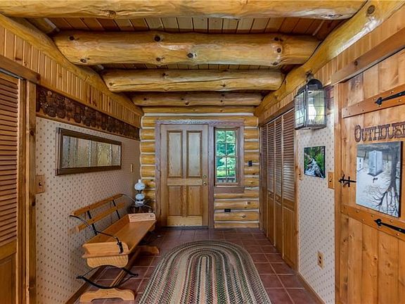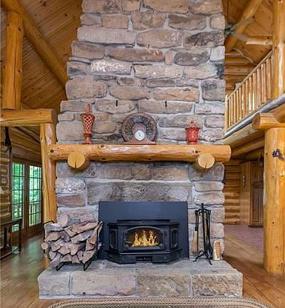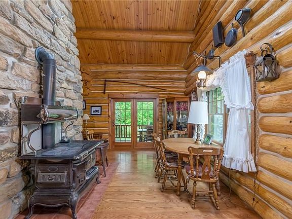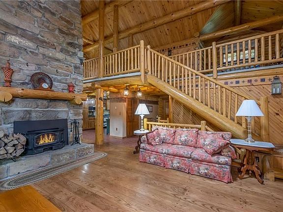 beautiful log home with massive logs ,this home was built to a higher statdard ,cut stone firepalce eight foot wide from floor to ceiling,cathedral ceilings,anderson windows and doors ,random wide oak flooring thruout main floor with walnut pegs,kitchen boast a a heartland peproduction six burner gas stove, the dining room features a antique prizer royal cooking and heating stove,main floor master suite,two loft bedrooms and a computer area on second floor, lower level has a fourth bedroom and a semi finished family room, 36 x 10 covered rear porch,10x8 covered front porch,2,284 square foot on the main and second floor , 680 semi finished square foot in lower level,one detached garage with a work shop ,and a chicken coop, paved drive way private and rustic,