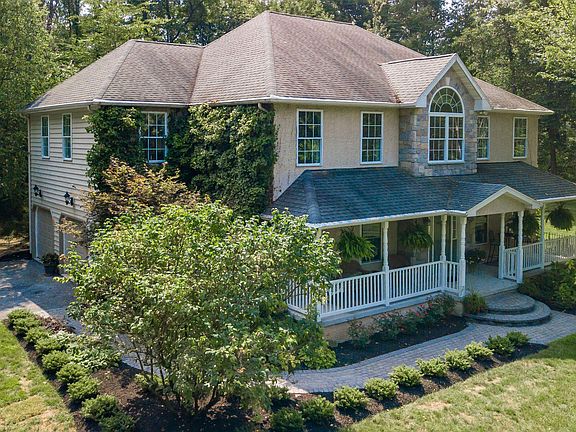 So much more character than new construction in the area, with more acreage, at about the same price...A meandering drive leads to a private, idyllic setting in which this beautifully appointed home sets, enveloped in the natural landscape of almost four acres. Vibrant ferns drape the expansive North-facing front porch, welcoming one into the two story foyer with hardwood floors and custom moldings which carry throughout the main level. Formal living and dining spaces, along with a vaulted great room with floor to ceiling stone wood-burning fireplace and plentiful windows, inviting Mother Nature in. Corian counters grace the bright yet warm kitchen, with stainless steel appliances, island, and two pantries. French doors open to PA Bluestone patio and arbor leading to the peaceful surround. Turned stairs with wrought iron spindles lead to three generously sized "tree house" bedrooms (as that is exactly what can be seen from each window), hall bath with double vanity and separate bath area, and the Owner's Suite with tray ceiling, cozy window seat, walk-in closet, and tiled bath with jetted tub, shower, and double vanity as well. Surprisingly sizable basement has recreation room along with two, possibly three other bedrooms (one presently used as fitness area), and double door entry to expansive laundry room with new flooring. Property has two-zone HVAC, sprinkler system, and two-car side entry garage with extensive parking area. It's obvious how much this property has been loved, anyone would be lucky to call it their own.