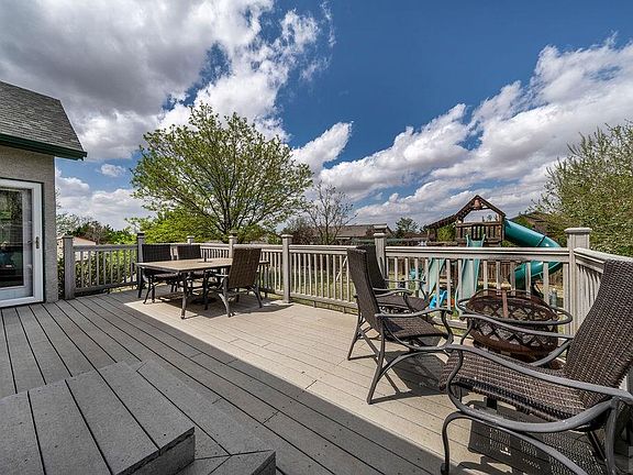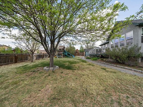 Brand new furnace and air conditioner! Seller has attractive loan in place for VA buyers to assume! Large home that will accommodate you! Close to shops, golf course, health club, library, plus schools. All city utilities. Eye-catching front with vaulted ceilings, wood and tile floors, eating space open to the conversational kitchen, & tons of storage, including 4 walk-in closets off bedrooms! Huge master suite with space for an office plus, a barn door closing off the 4 piece master bath with jetted tub, tile surround and counters, private commode, and an entrance to the large trex deck behind the house. Sunroom with extra windows is behind the living room. Garage shelving that stays. Finished basement open area has garden level windows. Perfect for games, pool table, theatre room and more! Separated slightly is another family room area currently used as a music room...if you needed 6 bedrooms, this would be an easy change. Two large unfinished storage rooms down here also, so you can have everything with you. Back side yard was specifically designed for an RV behind the wooden privacy fence. Large storage shed next to a separately fenced dog yard. From the large trex deck, you can see mountains, yet feel secluded in a private outdoor setting. Side load garage gives a grand appearance to the house. And the steep pitched roof adds class and appeal. Side deck off kitchen has a natural gas grill that stays. Attached stainless steel appliances stay.