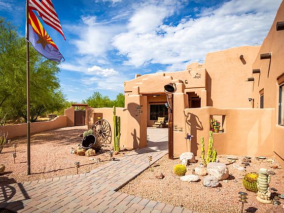 Enjoy the stunning view of the Superstition Mountains from the rooftop Ramada of this Custom SantaFe style home. The home features a huge master suite with fully remodeled master resort-like en-suite featuring a copper claw foot tub, shower with two shower heads and double vanity. Entertain guests or watch TV in the huge family room. Attached to the home is a guest suite with a remodeled, fully equipped kitchen, bedroom and full bath. Suite boasts a private entrance. The heated/chilled pool allows swimming year-round. A stand alone garage/workshop is next to the house. There are many more features to this beautiful home. You don't want to miss out.