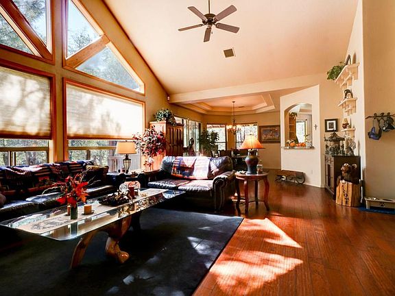 Custom, quality built one-level 3bd/2ba home with many upgrades situated on heavily treed corner 1.08 acre parcel. Tiled entry into spacious Living area boasts a stone wood burning fireplace w/insert, blower & mantle, built-in wall cabinets & shelving; vaulted ceiling; wood floors into huge dining room area with ceiling to floor windows for lots of light & cheery atmosphere; pass-thru to ''Gourmet'' eat in kitchen featuring dbl thick Granite counter tops & back splash, deluxe appliances, plenty of work prep zones including lg work Island,cabinets galore, built in desk, pantry cabinet w/pull-out shelves, pot shelves w/lites & access to wrap around covered deck. Master Suite has huge walk-in closet, dbl vanity, garden tub & shower; other bdrms share Jack & Jill bathrm. More amenities