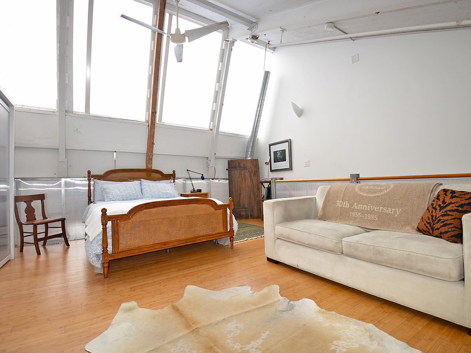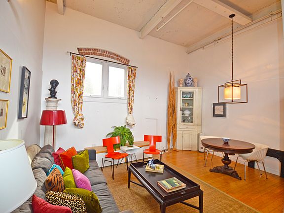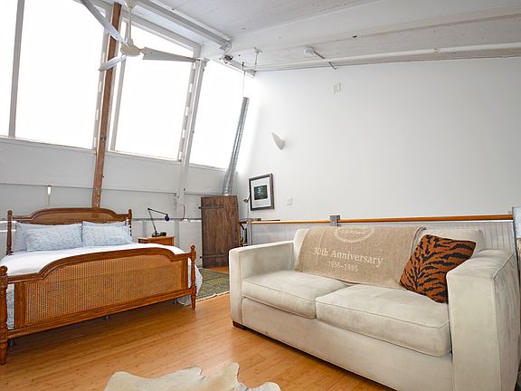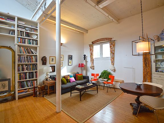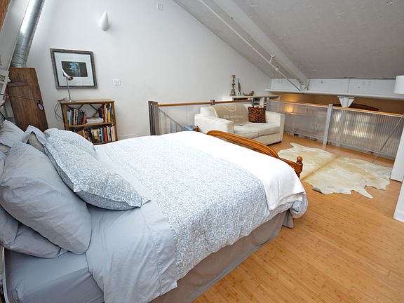A soaring ceiling with north facing skylights adds drama and light to this open, airy, live/work space. There is a spacious studio/work space as you enter (incl deep utility sink). Open concept kitchen / great room with stairs to lofted bedroom and half bath. Bamboo floors. Built-in bookshelves. Originally a rope works the building was re-conceived as an artist community. There is a communal gallery space in the common area and space outside for individual gardens. Complex abuts Riverside Park Pets allowed.