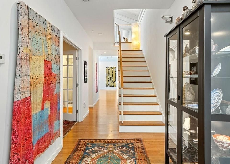 A soaring ceiling with skylights along the full length of the unit adds drama and north light to this open, airy, sun drenched, live/work space. This is a rare find and more typical of the aesthetic you would find in a finely appointed artist loft in Boston or New York. There is a spacious studio/library space as you enter. Choice of a first floor or second floor master bedroom (each with en suite baths). Open concept kitchen / great room with French doors leading to a private balcony. The second floor boasts an office / sitting area overlooking the studio/library space. There are bamboo floors throughout (except BRs and baths - Berber carpet and tile respectively). Kitchen counters are Firestone - made in Italy. Originally a rope works the building was re-conceived as an artist community. There is a communal gallery space in the common area and space outside for individual gardens. Pets allowed.