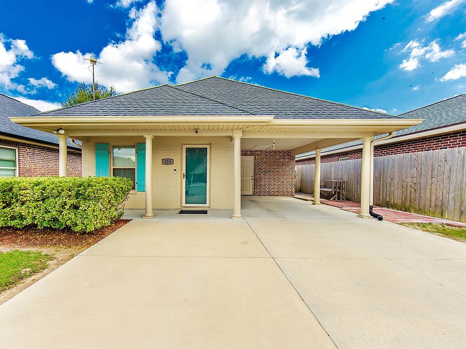 Welcome home to this sweet and cozy 3-bedroom, 2-bath charmer tucked away on a quiet, private street off of Bayou Blue Road. Immaculately maintained and move-in ready, this home offers an inviting open floor plan that feels bright and spacious, perfect for both everyday living and entertaining. Enjoy the ease of low maintenance living with minimal yard work, while still having an attached carport and detached storage for your convenience. Located in desirable Flood Zone X, this property combines comfort, practicality, and peace of mind. A true little treasure waiting for its next owner!