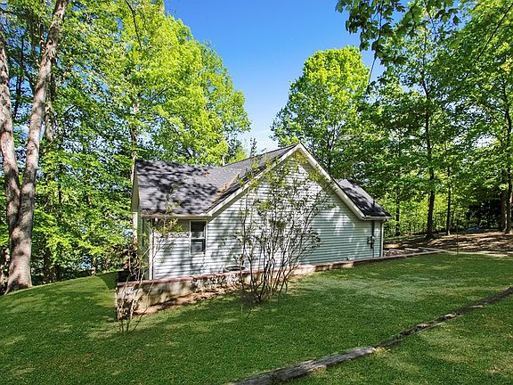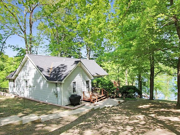 Kentucky Lake Living! Open great room - cathedral ceiling - wall of windows to enjoy the view. 2 bedrooms, multi use - bunk room on main level, 1 lower level family room w/ bunk area - if needed. Main level deck, lower level patio, steps down to the water & boat slip. Detached garage w/ steps to the home. Neat option to drive into the boat slip area. Comfortable Lake Home!