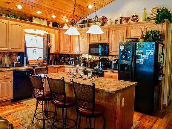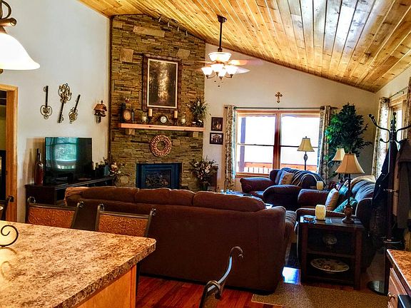 Special spot offering one level ranch beauty w/ 3 bedrooms & 2 baths -full unfinished basement which offers unlimited possibilities Open kitchen/living area w/ eat at island bar, copper tile backsplash, deep granite sink & under cabinet lighting highlighted by the beautiful wood ceiling & custom stacked stone fireplace. 3.45 wooded & rolling acres w/ large circular drive & level parking The outdoor living here is LARGE w/ covered decks on 3 sides of the home plus a 20x30 back yard Trex party deck w/ beautiful stone waterfall feature all surrounded by multi season landscaping Add in the 16x16 2 story tuff-shed & 8x10 storage shed, new metal roof w/ copper gutters and you just can't go wrong