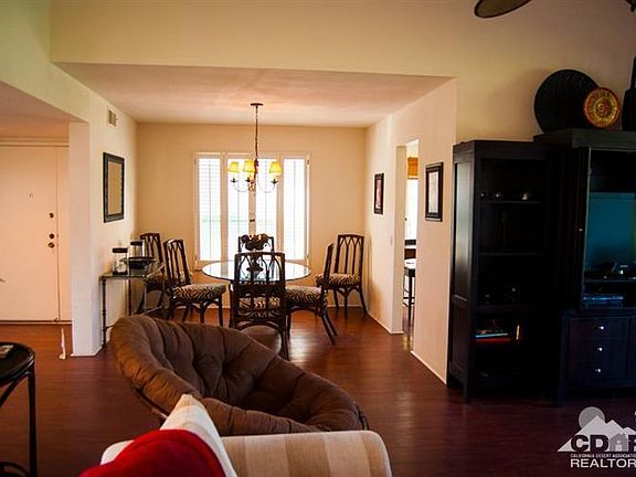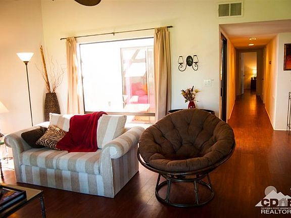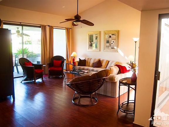 Beautiful light and bright 3 bedroom, 2 bath condo, located in the Rancho Las Palmas Country Club on the 4th fairway of the South golf course. Recently remodeled with updates such as hardwood floors, ceilings and ceiling fans, renovated bathrooms and appliances. There is a designated dinning area and breakfast area and wonderful view of the golf course in the kitchen The tiled patio has a ceiling fan, built in BBQ. The laundry room has direct access to the garage. There is still room for the buyer to add their own touch and make it home. Don't miss out on this great deal.