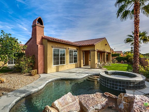 Great value in sought-after Santo Tomas with its lovely lake/lagoon! Just $241/sq.ft. where the recent average sale price for similarly sized homes is $292/sq.ft. Move-in condition enhanced by fresh paint and new carpet. Lovely 3 bedroom - 2 bath + powder room home. The walled and private rear yard with spectacular mountain views and pool with charming water feature is elevated above Dean Martin away from the road noise of Dinah Shore and Da Vall Drives. Living room has a bar/butler's pantry connected to the kitchen and a wall of glass connecting it by sliders to an intimate patio with gas fire pit. Entertainer's kitchen with warm wood cabinetry, black granite counters, prep sink and 5-burner gas cooktop opens to a light and bright great room with fireplace. Master suite with spa-like bath also opens to the private intimate patio. On the other side of the residence are the two other bedrooms giving privacy to the master suite. Ceilings fans in all rooms and covered rear patio.