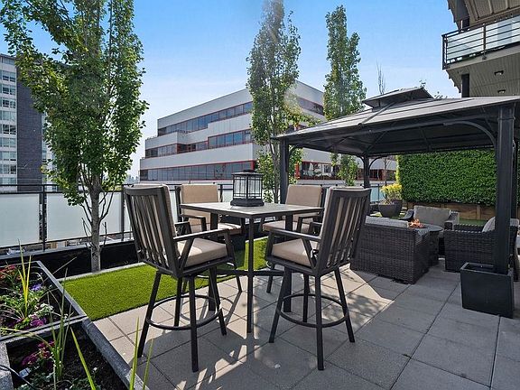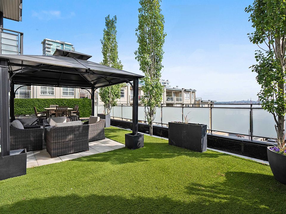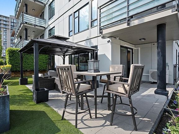 Rarely available 2 bed + den, 2 bath home in sought-after First Street West, Lower Lonsdale. This bright south-facing home features 9-ft ceilings, open concept layout & electric fireplace that adds warmth and style. The chef-inspired kitchen is ideal for cooking and entertaining, complete with S/S appliances, gas range, wine fridge, and ample cabinetry. The thoughtful layout offers great separation between bedrooms, ideal for privacy or guests. Enjoy year-round comfort with bonus A/C, and an incredible 1000 SF private patio—fully outfitted with turf, gazebo, firepit, and lounge seating. An entertainer's dream, offering peek-a-boo views and complete privacy. 2 parking + locker. Building includes a fabulous rooftop terrace + lounge.This one ticks all the boxes!