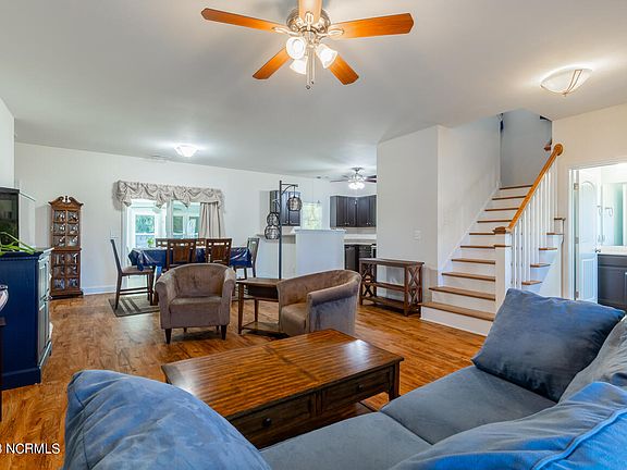 This 4-bedroom home in Rocky Point's Fall Brook subdivision offers modern comfort in a serene suburban setting. Its open floor plan seamlessly connects the living, dining, and kitchen areas. Large windows in the living room create a bright, inviting space.
