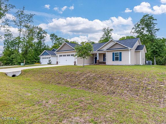 This wonderful ranch style home sits on over a half-acre lot and is in the small Waterford Ridge subdivision near Camp Lejeune gates, shopping, restaurants and beaches. There's also NO city taxes! This home is move in ready and waiting for its new owners. As you arrive, you'll be welcomed with an inviting covered front porch. Enter the main living area with an attractive open concept layout and easy-care laminate flooring. In the living room you'll find a vaulted ceiling and a fireplace with slate hearth. Enjoy family dinners in the dining room or quick meals at the kitchen island. The kitchen boasts beautiful dark walnut cabinetry, ample counter space, a pantry, Stainless steel appliances. For convenience, the garage opens to a large laundry room. In the master bedroom you will find a tray ceiling, walk-in closet and bathroom with dual vanities and another walk-in closet. Down the hall is the main bathroom and two more bedrooms. Sit on your back patio and enjoy the large backyard and all that nature has to offer. No need to worry about extra storage space as there is a shed out back. This home won't last long so schedule a showing today!
