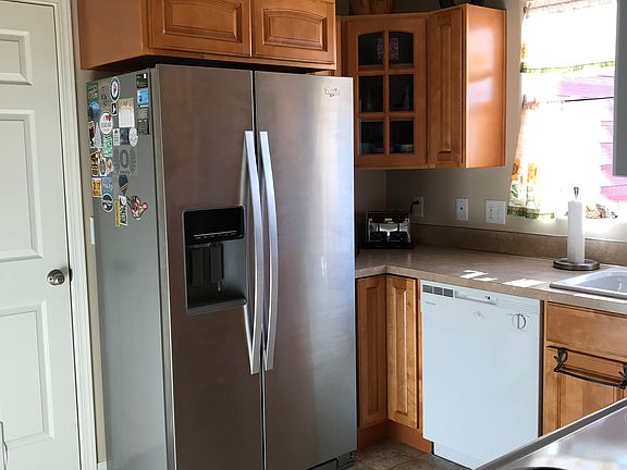 Three bedrooms, master bedroom has vaulted ceiling with fan. Two full bathrooms, master has double sinks and shower, guest bathroom has tub. Living and dining area as one great room, has vaulted ceiling and a ceiling fan. Kitchen is easy access for cooking, also a glass door cabinet. Laundry closet in kitchen and works well as pantry. Wall unit heaters, yet electricity has been average at $80 a month. Refrigerator and a portable air conditioner can be negotiated. Cable ready, dish ready, and antenna ready for your viewing pleasure. Garage can hold two small cars, it also has a carport along side of garage, and parking for three cars in driveway, or two cars and RV. Move in ready.